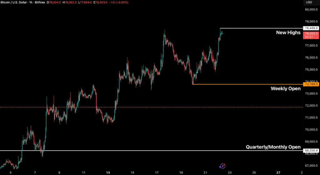 Bitcoin has moved above $78,000 and the momentum for price is decidedly towards upside since breaking past earlier range highs near $72k. This move is the product of two simultaneous geopolitical and on-chain shocks landing within 72 hours of each other.