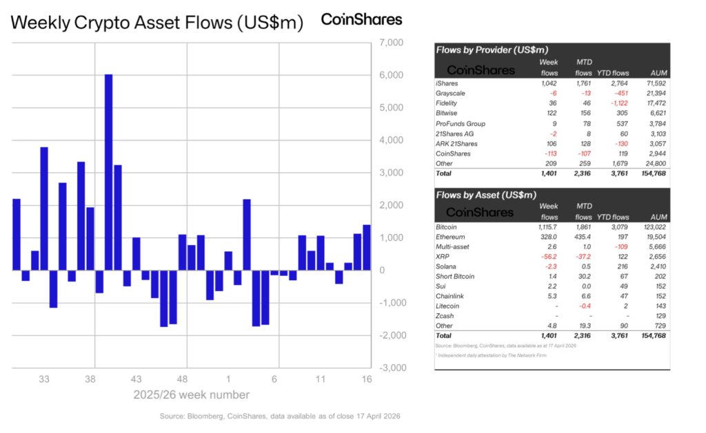 In addition, liquidity that benefits digital assets is increasing. Stablecoin supply hit $320 billion on 16 April, with $2.54 billion of seven-day inflows ($1.37 billion from USDt and $431 million from USDC). Stablecoin expansion is the cryptocurrency equivalent of M2 growth, and it has expanded every single week of Q2. Aggregate cryptocurrency Exchange-Traded Fund (ETF) flows have now flipped positive year-to-date to +$2.3 billion, with IBIT alone absorbing $871 million last week, nearing $64 billion in cumulative net assets.